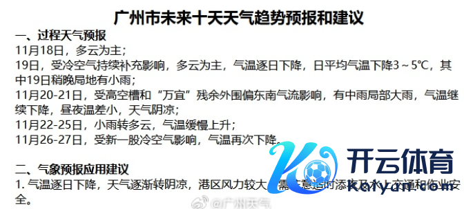 据广州市应允台展望,将来三天广州受冷空气捏续补充影响,气温每日着落,日平均气温着落5~6℃,11月21日达到经过最低气温:北部12~14℃,中南部14~17℃。11月19日凌晨起广州港区阵风冉冉增大到6~8级。
