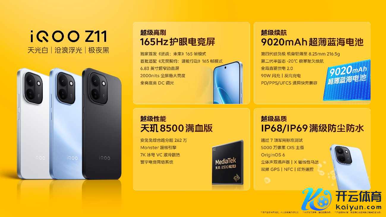 影像方面,后置5000万像素OIS主摄及1600万像素前置镜头,撑合手蓝厂全自研东说念主像算法及清透蓝调滤镜,新增iQOO签到水印。其他成就包括7K冰穹VC液冷散热、立体双扬、六合电竞集中系统、屏下指纹、全功能NFC、红外遥控及双频GPS。机身撑合手IP68/IP69防尘防水,具备一键排水清灰功能,通过7项国度军用圭表测试。系统搭载OriginOS 6.0,撑合手一键开启作事口头。