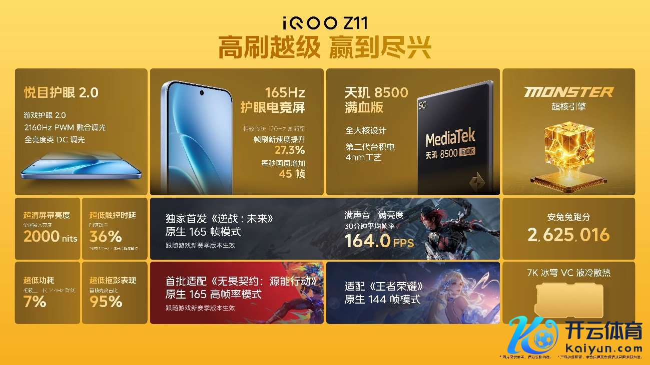 该机首发《逆战:往时》原生165超高帧口头,在最大音量及最高亮度下平均帧率达164FPS,同期首批适配《丧胆契约・源能活动》原生165FPS,并障翳《工作召唤》《跑跑卡丁车》等多款手游的165FPS口头。