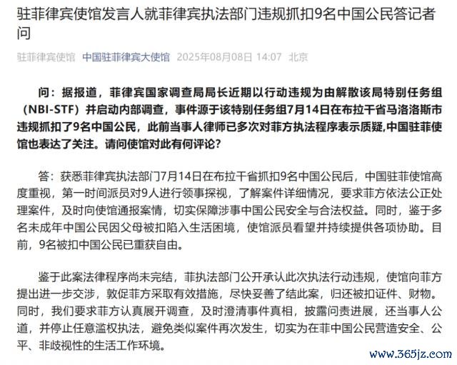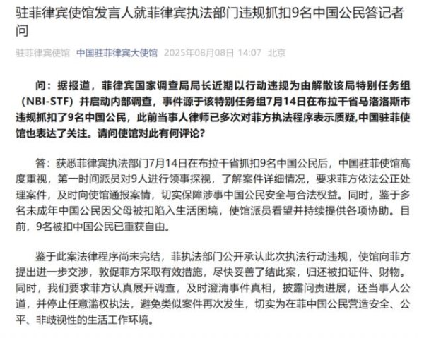 答:获悉菲律宾法则部门 7 月 14 日在布拉干省持扣 9 名中国公民后,中国驻菲使馆高度青睐,第一技能派员对 9 东说念主进行领事探视,了解案件细情愫况,条目菲方照章公道解决案件,实时向使馆通报案情,切实保险涉事中国公民安全与正当职权。同期,鉴于多名未成年中国公民因父母被扣堕入生存逆境,使馆派员拜访并不竭提供各项协助。当今,9 名被扣中国公民已重获解放。